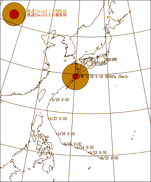 今回の台風第2号(ソングダー)は平成23年05月29日10時45分気象庁の発表によると、29日10時の実況で最大風速30m/s、15m/s以上の強風域は全域390kmとなっていますので、上記の基準に当てはめると、「強くもなく」「大きくもない」台風といういことになります。