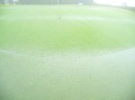 マスター室前のグリーン練習場の様子を撮影してみましたが、水たまりでボールが転がる状態ではありませんでした。