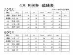 4月 月例杯成績 Author ブログ担当 Date 2010年5月13日 4/25(日)に月例杯を開催しました。 Aクラス 32名 西垣戸康俊様が G 68 H 8 N 60 ベスグロで優勝しました。 Bクラス 27名 大末一了様が G 84 H18 N 66で優勝しました。 2位以下入賞者は下記の通りです。