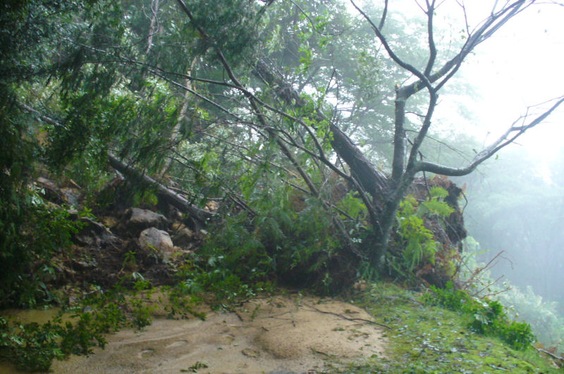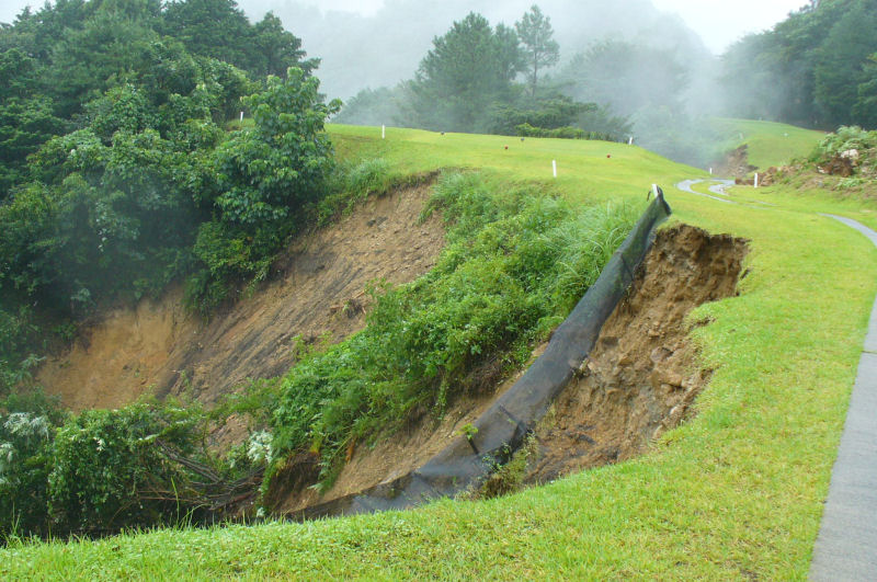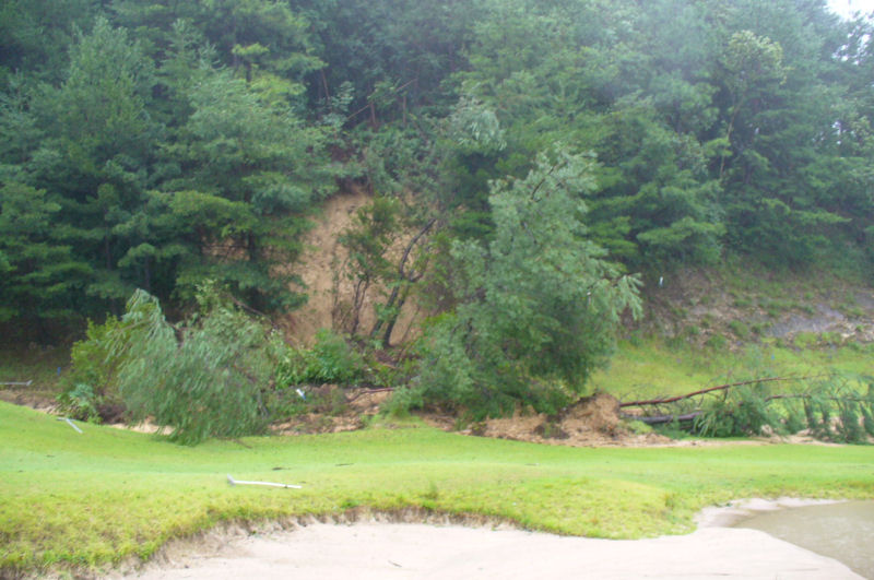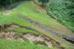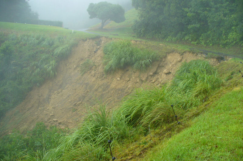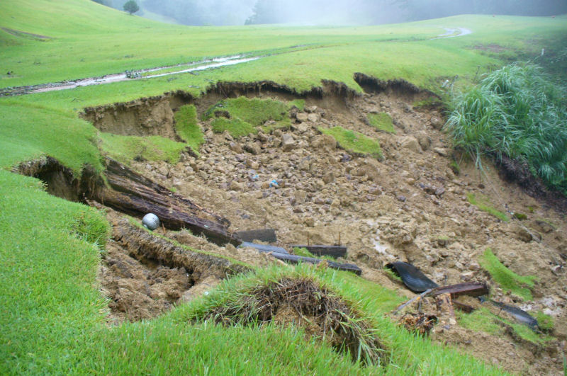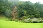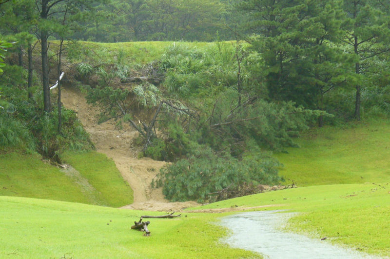 ◆12番ホール 150ヤード地点~グリーン手前の右の谷(カート道路の一部も崩落)