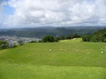 【No.10ティーグラウンドから望む。青い空と白い雲。そして那智勝浦の町並みとNo.10グリーン】