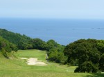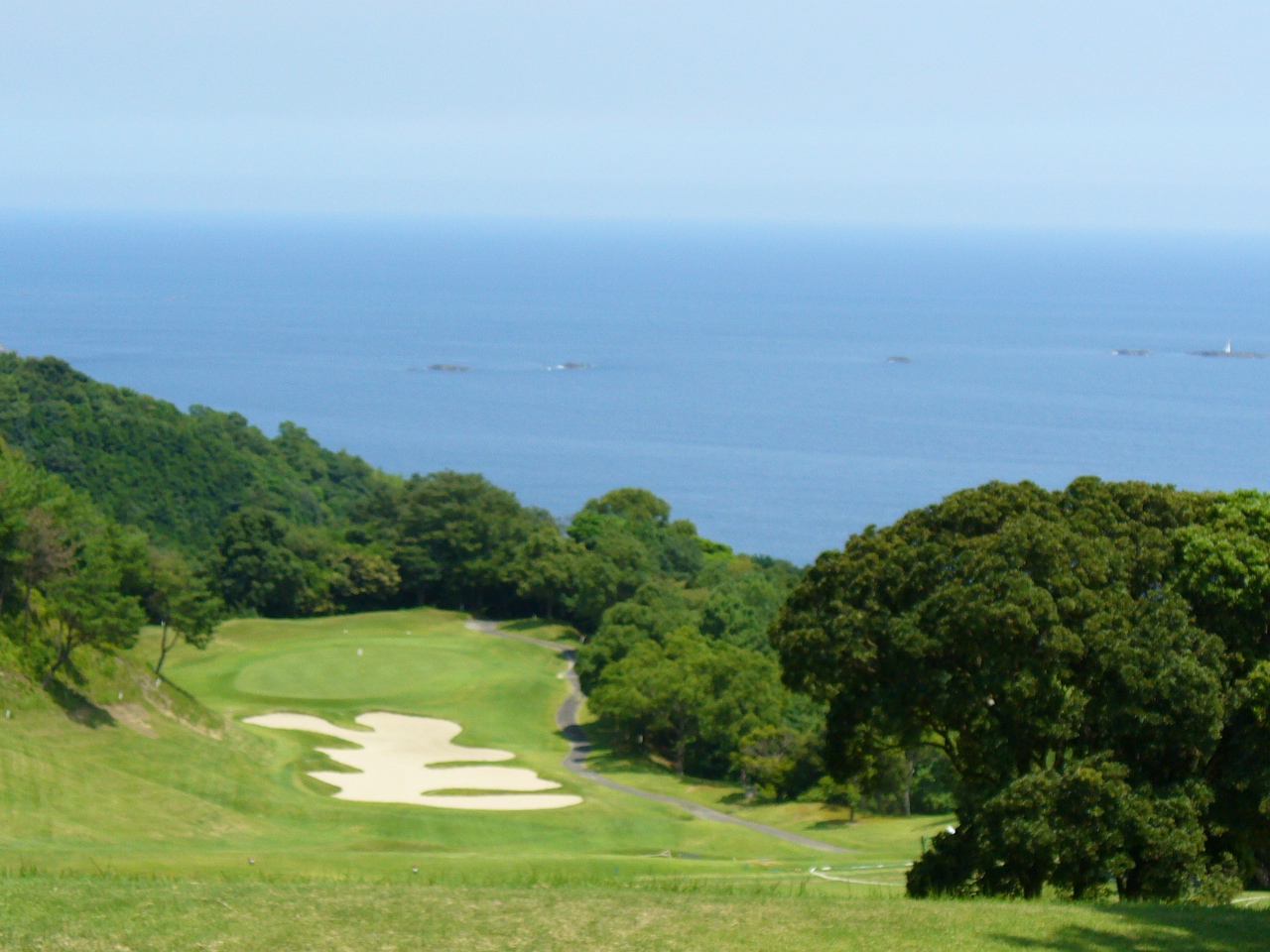 INは熊野灘を見渡せ、16番H(PAR3)は海からの風が強く、高低差25mの打ち下ろしで、当倶楽部の名物ホールです。